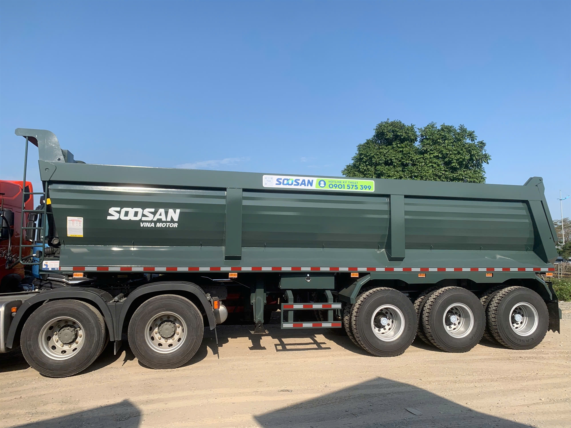 Khi kết hợp với mooc ben Soosan, bộ đôi này càng phát huy tối đa hiệu suất làm việc. Mooc ben Soosan nổi bật với kết cấu thép cường lực chắc chắn, chịu tải lớn, phù hợp với các cung đường công trình, mỏ vật liệu. Hệ thống ben thủy lực hoạt động ổn định, nâng hạ nhanh, giúp tiết kiệm thời gian bốc dỡ hàng hóa. Thiết kế thùng tối ưu giúp hạn chế bám dính vật liệu, nâng cao hiệu quả vận chuyển.